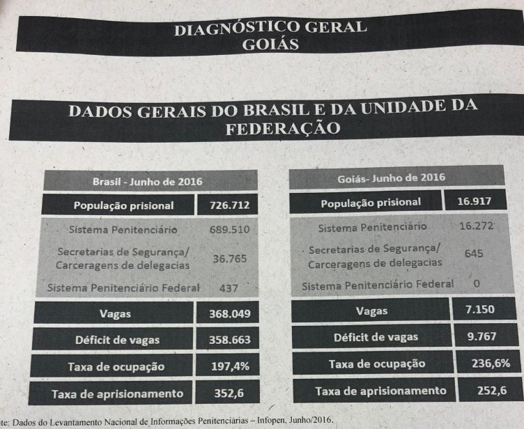 Com uma população prisional de 16.917 indivíduos, de acordo com o documento, Goiás tem uma taxa de ocupação penitenciária de 236,6% – mais que o dobro da capacidade -, superior à média nacional, de 197,4%. Dos presos, o estado tinha à época 16.272 detentos no sistema penitenciário e outros 645 em carceragens de delegacias. Veja a seguir: