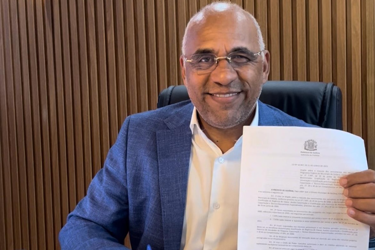 Depois da Câmara Municipal aprovar nesta quarta-feira (21), o prefeito Rogério Cruz (Republicanos) sancionou o projeto de lei que reajusta a remuneração dos professores da rede municipal de Goiânia em 14,95%, de acordo com o Piso Nacional da carreira. Segundo o texto, o reajuste será pago em duas vezes. Dos quais 7,50% será pago de forma retroativa para maio e 7,45% a partir de outubro.