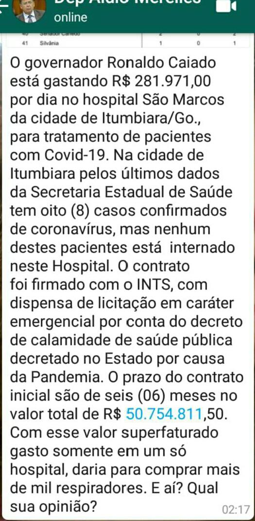 Na mensagem atribuída a Cláudio, é informado que “governador Ronaldo Caiado está gastando R$ 281.971,00 por dia no hospital São Marcos da cidade de Itumbiara/GO, para tratamento de pacientes com Covid-19. Na cidade de Itumbiara pelos últimos dados da Secretaria Estadual de Saúde tem oito (8) casos confirmados, mas nenhum destes pacientes está internado neste hospital. O contrato foi firmado com o INTS, com dispensa de licitação em caráter emergencial por conta do decreto de calamidade de saúde pública decretado no Estado por causa da Pandemia. O prazo do contrato inicial são de seis (06) meses no valor total de R$ 50.754.811,50. Com esse valor superfaturado gasto somente em um só hospital, daria para comprar mais de mil respiradores. E aí? Qual a sua opinião? (sic)”