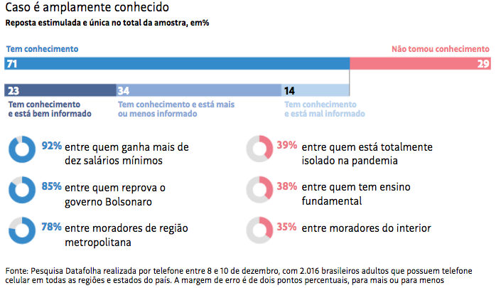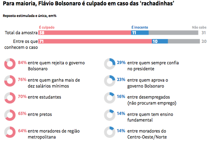Pesquisa Datafolha realizada em dezembro mostra que 58% dos brasileiros considera o senador culpado no caso da “rachadinha”. Segundo a pesquisa , 11% o consideram inocente, e outros 31% não souberam responder.