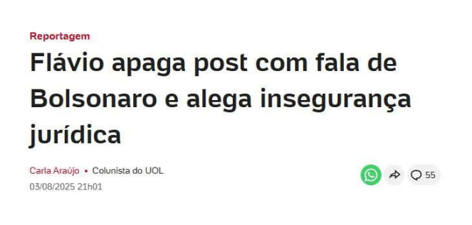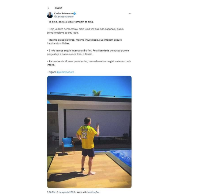 No mesmo dia 3 de agosto, continua o despacho, outro filho do ex-presidente, o vereador Carlos Bolsonaro, também realizou uma postagem nas redes sociais com pedido para seguirem o perfil do pai: “sigam @jairmessiasbolsonaro”. Mesmo tendo conhecimento das medidas cautelares.