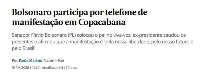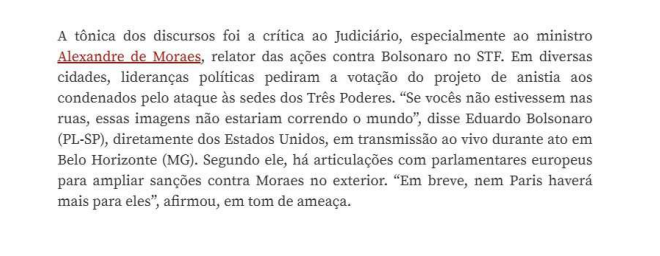 Moraes diz que a participação de Bolsonaro nos atos em apoio a ele, sobretudo no Rio de Janeiro, ecoou nos veículos de imprensa, como o Valor Econômico: