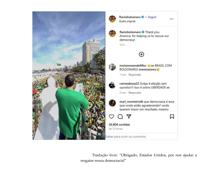 O ministro relata que Flávio também publicou uma postagem no próprio perfil do Instagram com uma legenda de agradecimento aos Estados Unidos, em uma clara manifestação de apoio às sanções econômicas impostas à população brasileira: