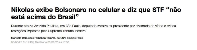 A última evidência reunida por Moraes no despacho é uma notícia da CNN que informa que o deputado federal Nikolas Ferreira abriu as redes sociais para exibir Bolsonaro e, segundo o ministro, “coagir o Supremo Tribunal Federal e obstruir a Justiça”.