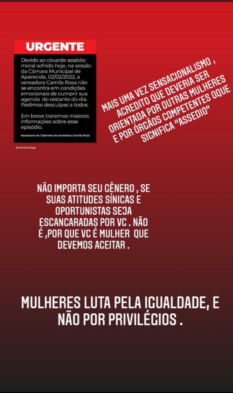Por meio de nota no Instagram, a vereadora informou a suspensão da agenda desta quarta. “Devido ao covarde assédio moral sofrido hoje, na sessão da Câmara Municipal de Aparecida, 02/02/2022, a vereadora Camila Rosa não se encontra em condições emocionais de cumprir sua agenda do restante do dia. Pedimos desculpas a todos. Em breve traremos maiores informações sobre esse episódio.”