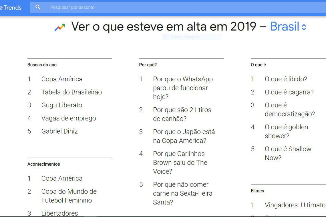 Pesquisa Veja o que esteve em alta no Google no Brasil em 2019 Copa América, tabela do Brasileirão, Gugu Liberato, vagas de emprego e Gabriel Diniz. O que… há 5 anos