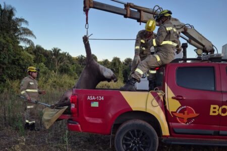 Atropelamento Bombeiros resgatam anta ferida na zona rural de São João D’Aliança Segundo os militares, a anta pode ter sofrido uma fratura ou lesão medular há 4 mêss