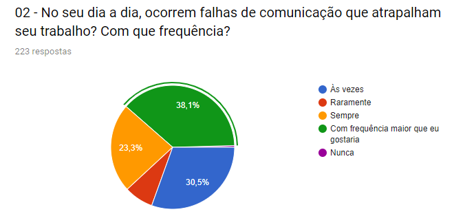 Outro ponto de muita relevância na pesquisa, foi a frequência com que acontecem erros nas empresas devido a falhas de comunicação. De acordo com 38,1%, ou seja, 85 pessoas afirmaram que os erros ocorrem com frequência maior do que elas gostariam.