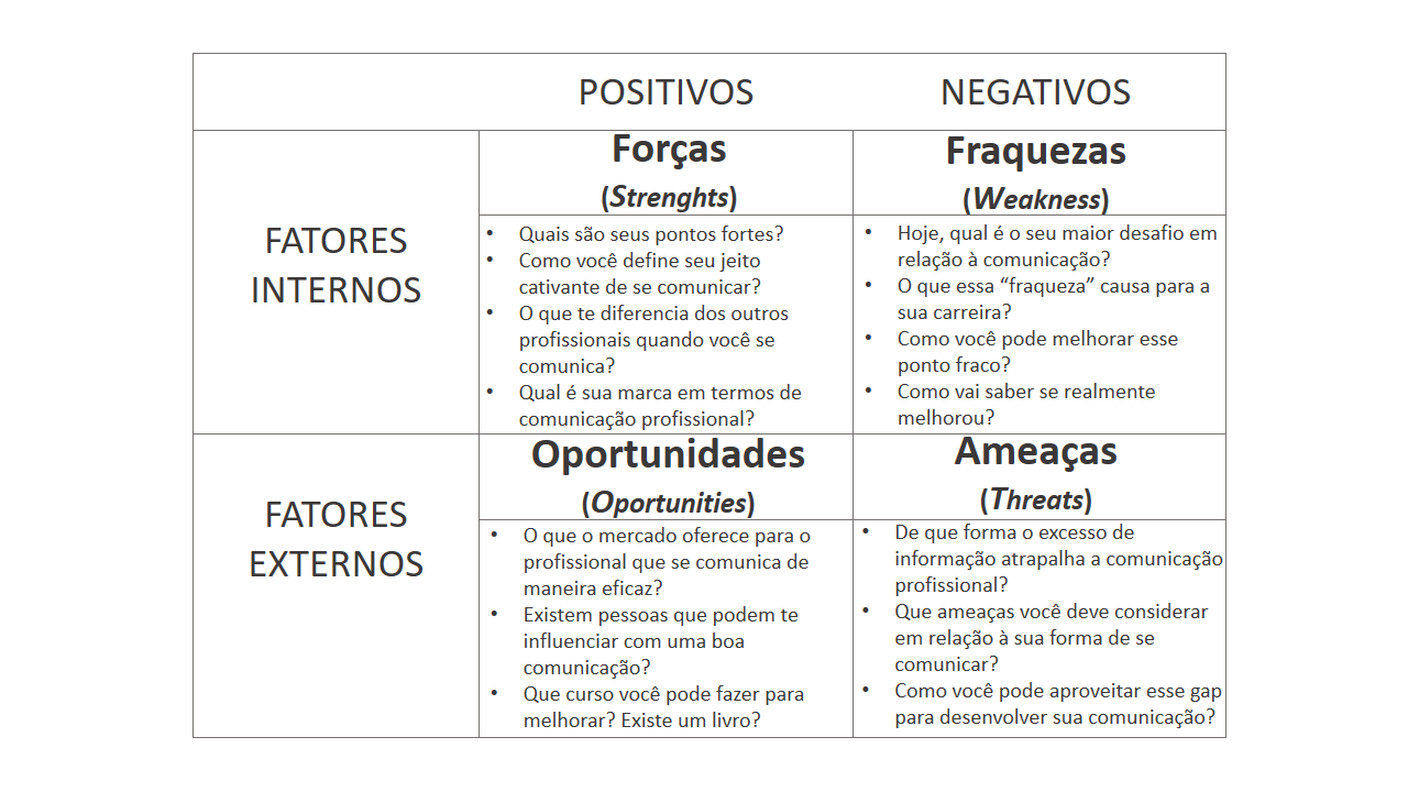 Ter uma comunicação eficaz tem muito a ver com a consciência a respeito de aspectos importantes que tangem nossa competência comunicativa. Ou seja, isso ocorre quando compreendemos nossos pontos fortes, nossas limitações, conhecemos ameaças externas e também aproveitamos as oportunidades geradas pela comunicação. Abaixo podemos usar a ferramenta Análise de SWOT, que nesse caso adaptei para o tema comunicação profissional.