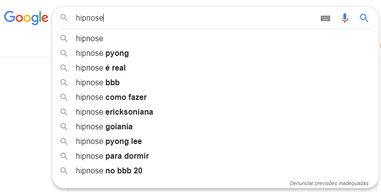 Não deu outra, as pessoas ficaram curiosas sobre o assunto. Ao fazer uma rápida busca, a ferramenta de autocomplete do Google – que é outro termômetro em tempo real sobre tendências de buscas – mostra que as pessoas têm dúvidas e curiosidades em relação à Hipnose, como mostra a imagem abaixo: