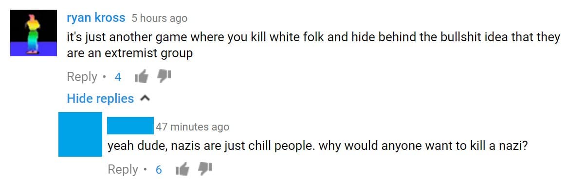 O problema é que desde que o jogo foi revelado ontem, o Twitter, o Facebook, o Youtube e fóruns (a parte mais sinistra da internet moderna) estão cheio de comentários de neonazistas revoltados com o jogo.