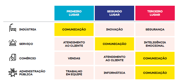 O estudo mostrou que 51% do investimento em treinamentos destinados para as lideranças e 31% para os não líderes são relativos a desenvolvimento comportamental. A comunicação foi apontada como uma habilidade de desenvolvimento prioritário e unânime entre todos os segmentos pesquisados, como mostra a figura abaixo: